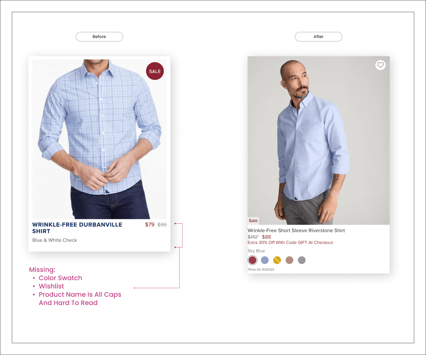 To enhance the design, I restructured the product information below the images for improved readability, addressing the previous layout's scattered and distracting presentation. Additionally, I replaced text-only color descriptions with color swatches, allowing customers to better visualize and differentiate colors, thereby reducing confusion and enhancing their shopping experience.
