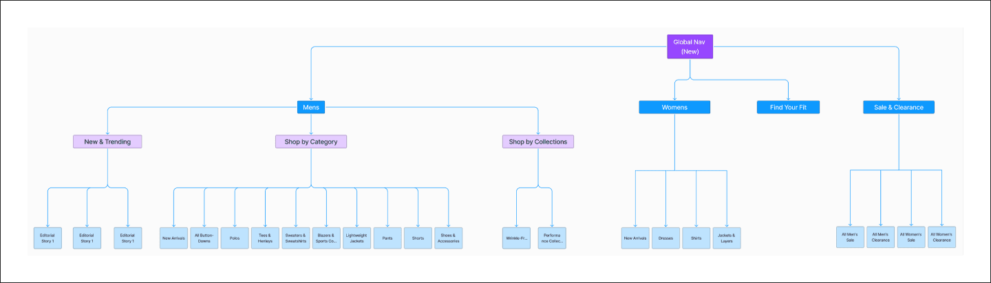 I consolidated similar categories, removed redundant links, and used clear labels to create a clean, intuitive interface. This minimalist approach improved navigation findability and reduced cognitive overload, resulting in a more efficient shopping experience.