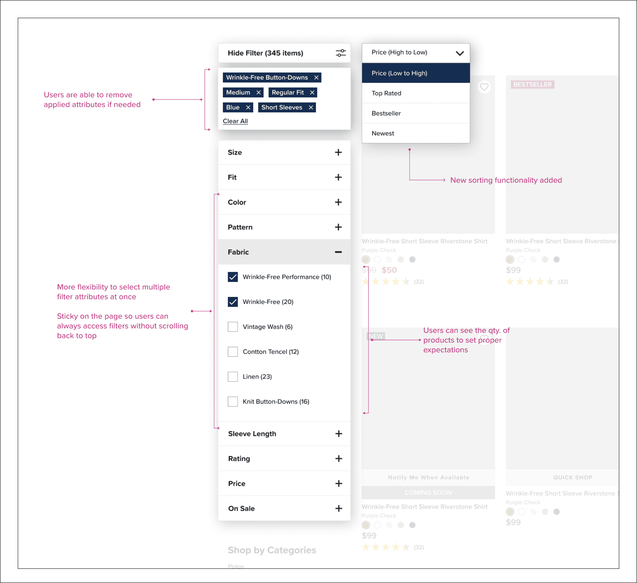 The old design had over-categorized links and limited users’ choices. We changed them to be filter attributes so users can select multiple filters to satisfy their specific needs.